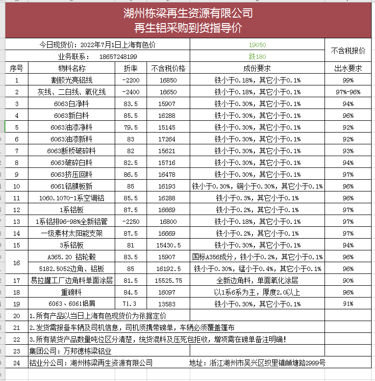 湖州栋梁再生资源有限公司 2022.07.01. 再生铝采购到货指导价