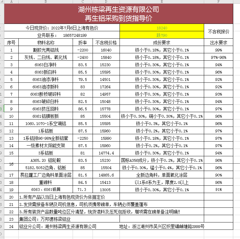 湖州栋梁再生资源有限公司 2022.07.06.再生铝采购到货指导价