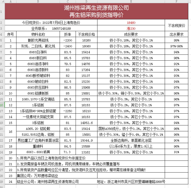 湖州栋梁再生资源有限公司 2022.07.08 再生铝采购到货指导价